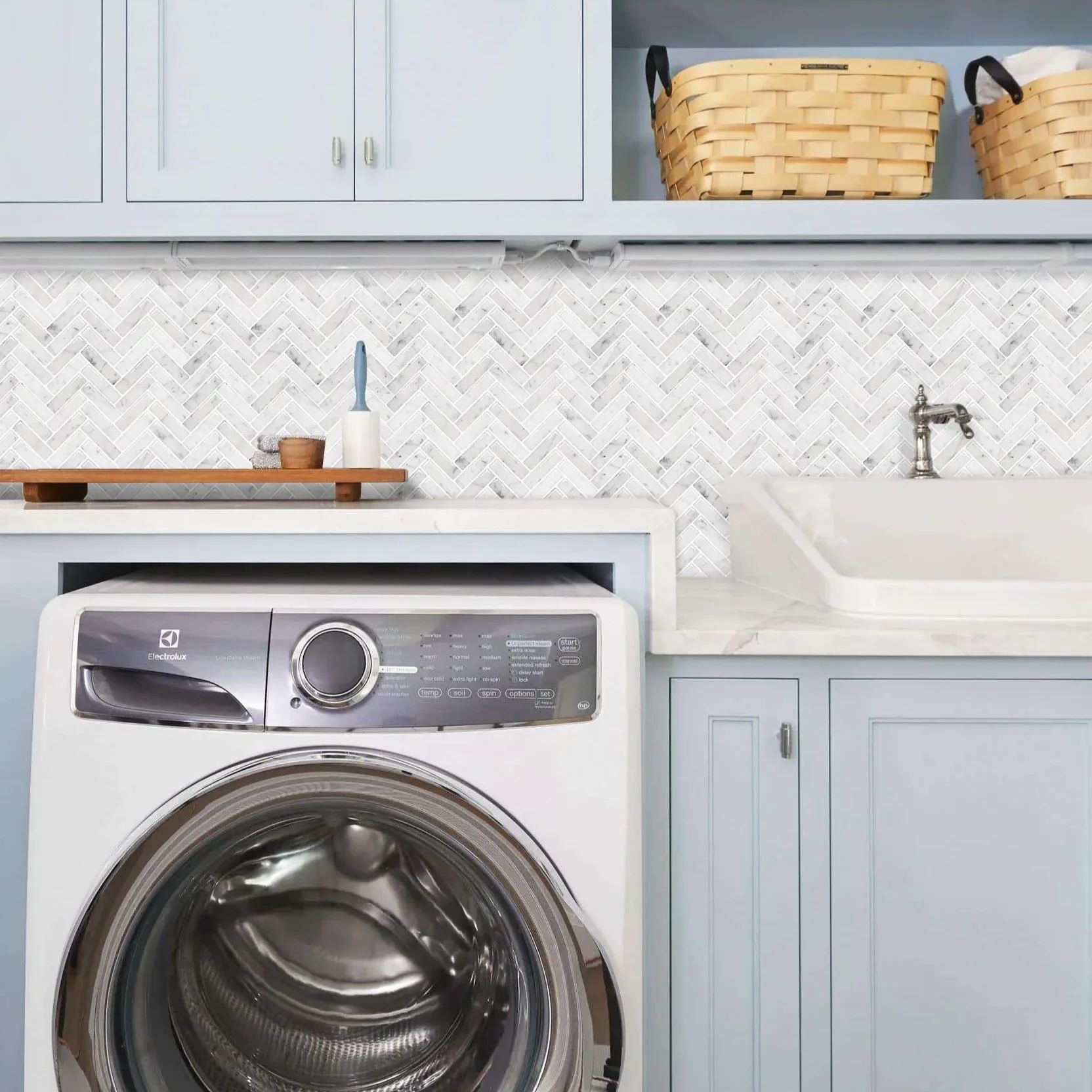 About Backsplash: Elevate your space with our Carrara Marble Look Herringbone Tile in Carrara White. Mimicking the natural beauty of marble, its herringbone pattern adds dimension and sophistication to any room. Transform your home with the elegance of luxurious Carrara into an exclusive retreat.